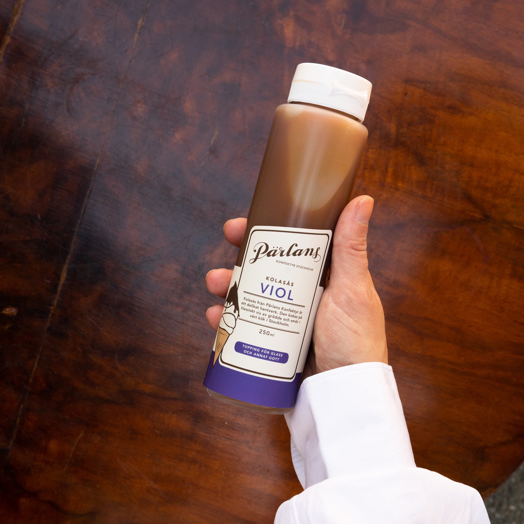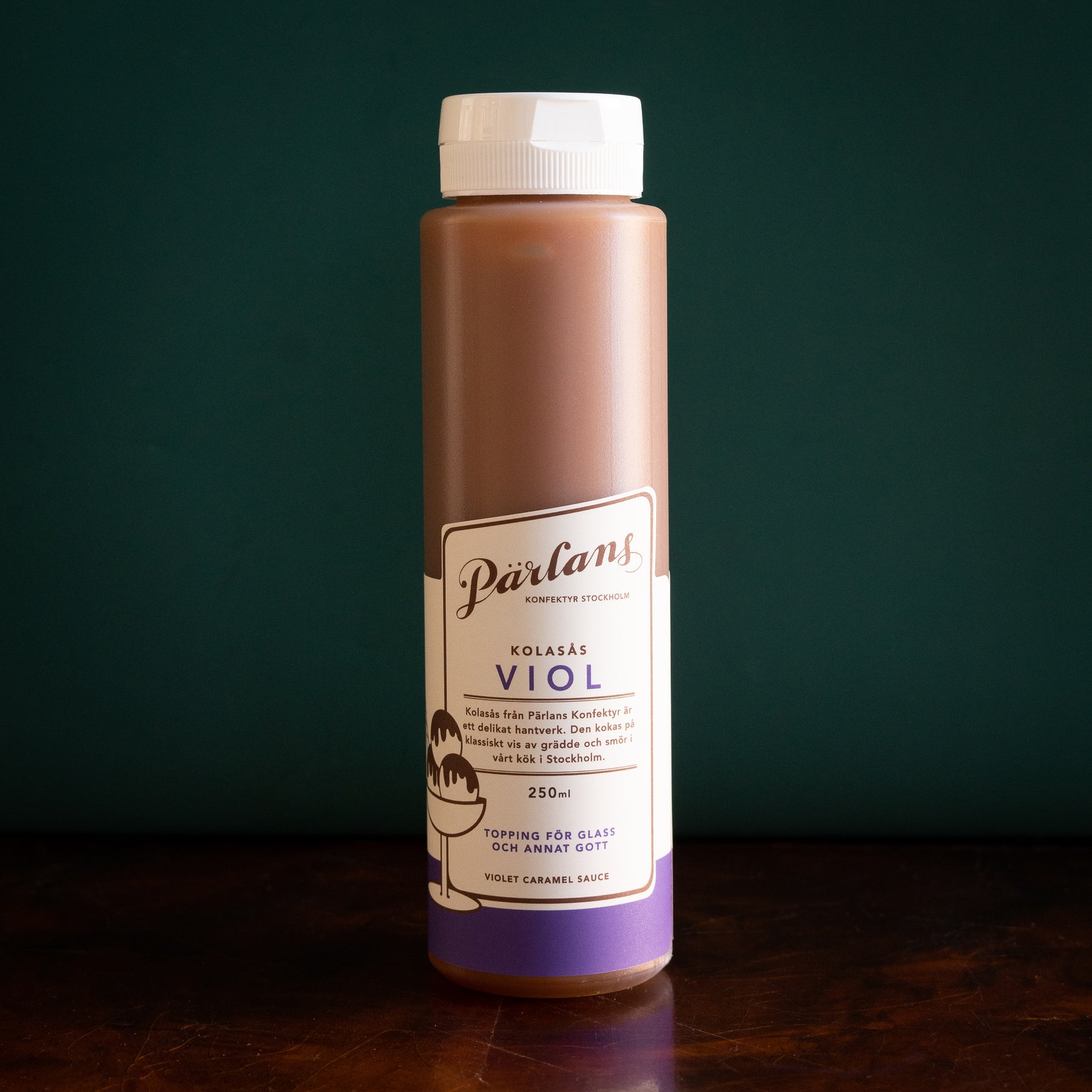 Vår älskade kolasås i squeezeflaska, ringla generöst över glass och andra desserter. VIOL - blommig med en ton av lakrits. Ett hantverk från Pärlans Konfektyr i Stockholm.