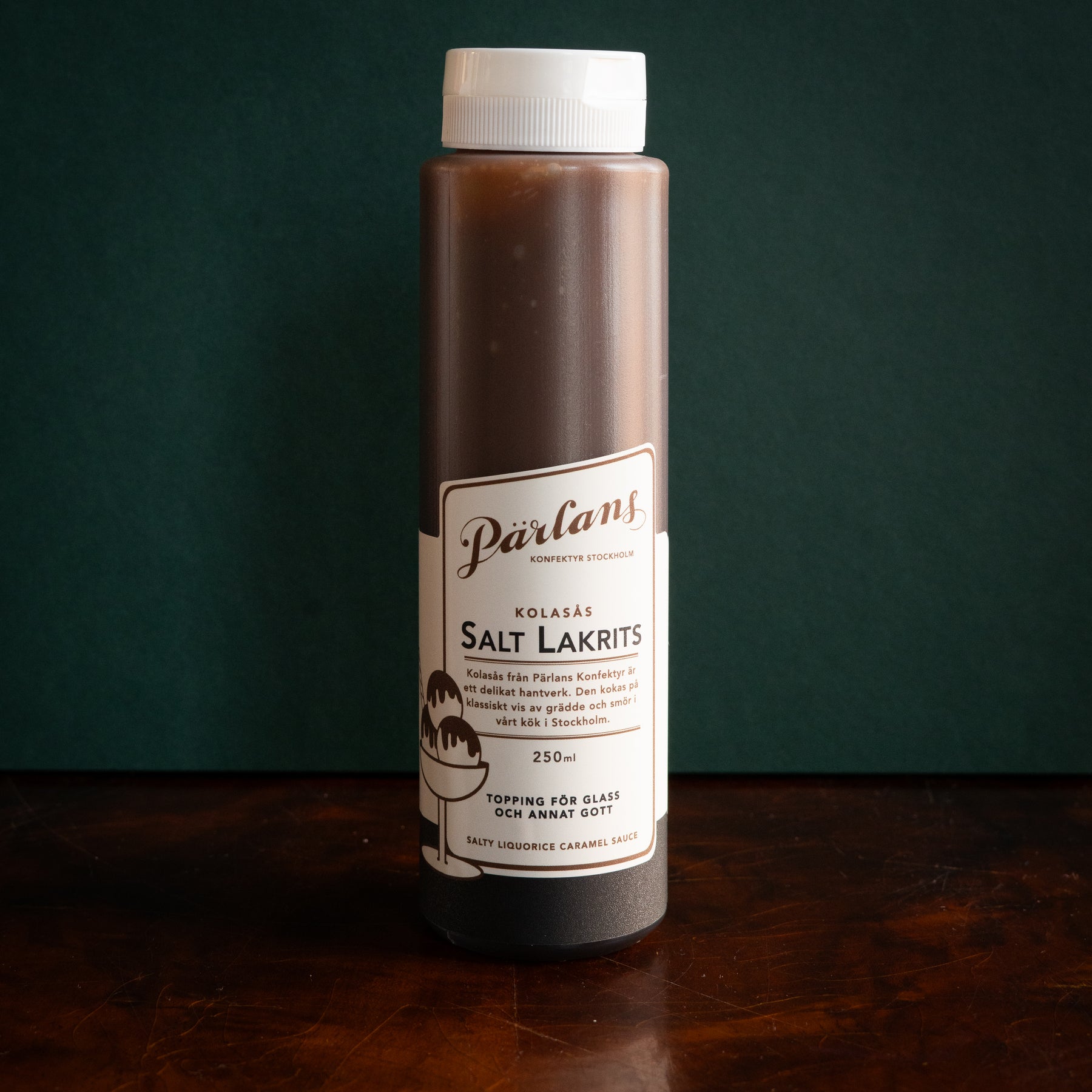 Vår älskade kolasås i squeezeflaska, ringla generöst över glass och andra desserter. SALT LAKRITS - Gräddig, söt och härligt salmiaksalt. Ett hantverk från Pärlans Konfektyr i Stockholm.