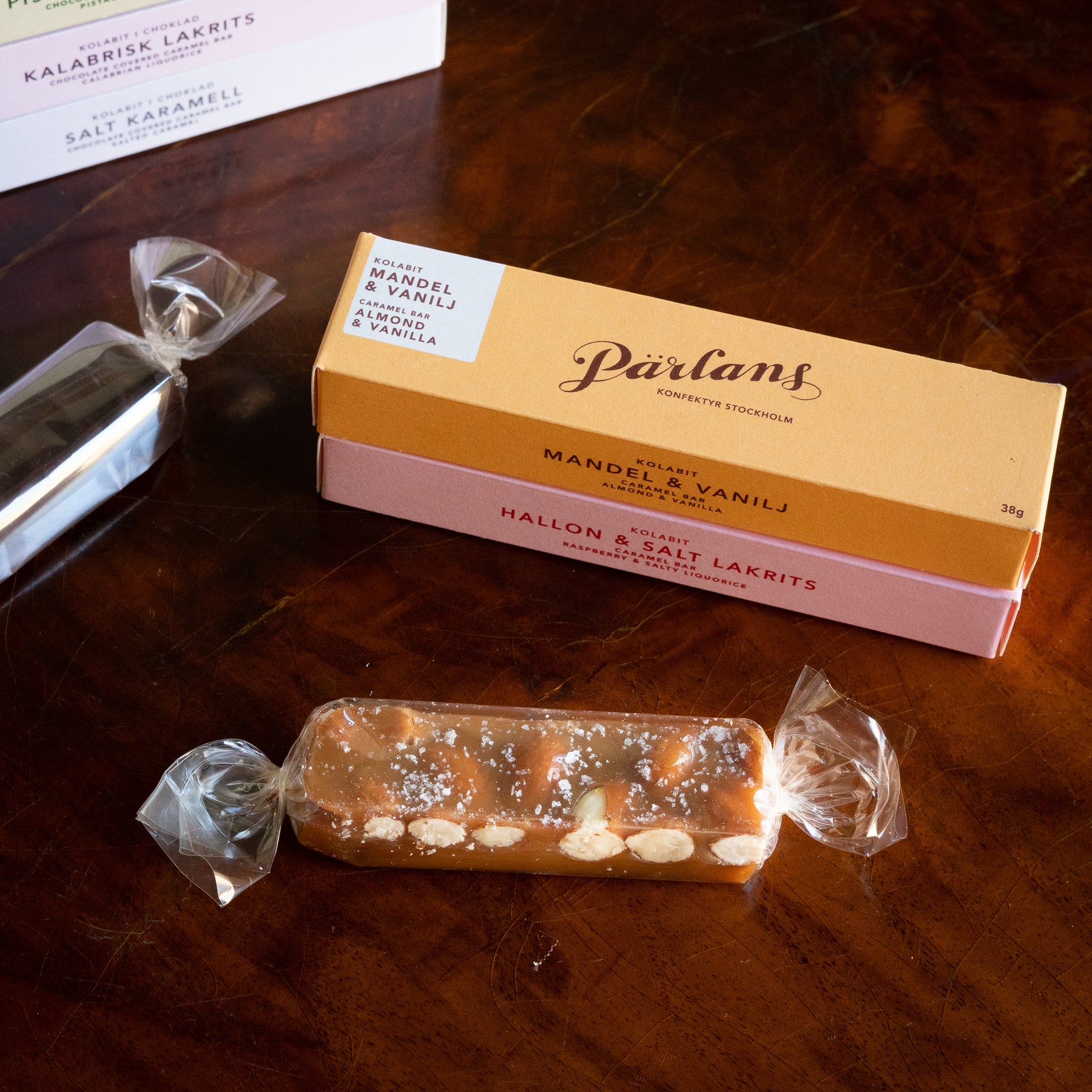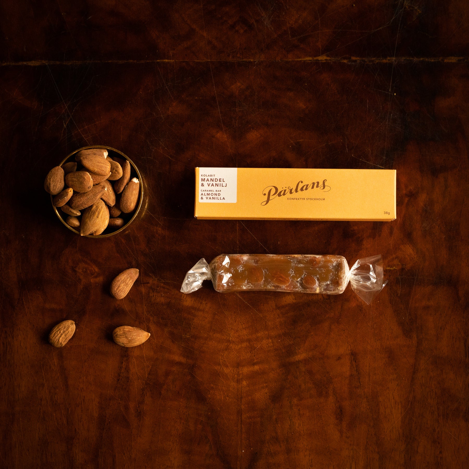 MANDEL & VANILJ - en bit len kola kryddad med bourbonvanilj och crunchiga bitar av rostade spanska, salta mandlar. En otrolig kombination av sött och salt!