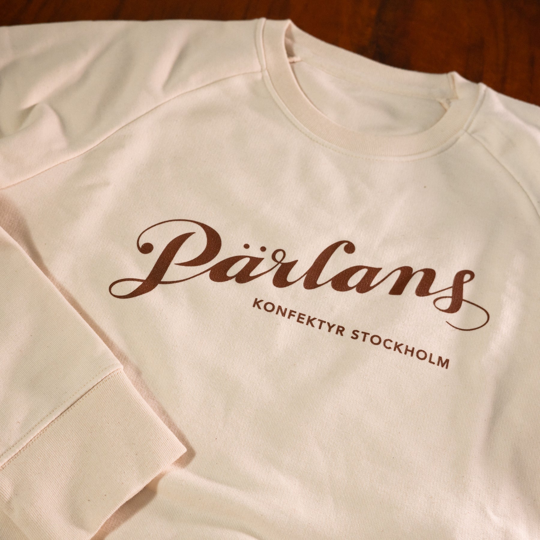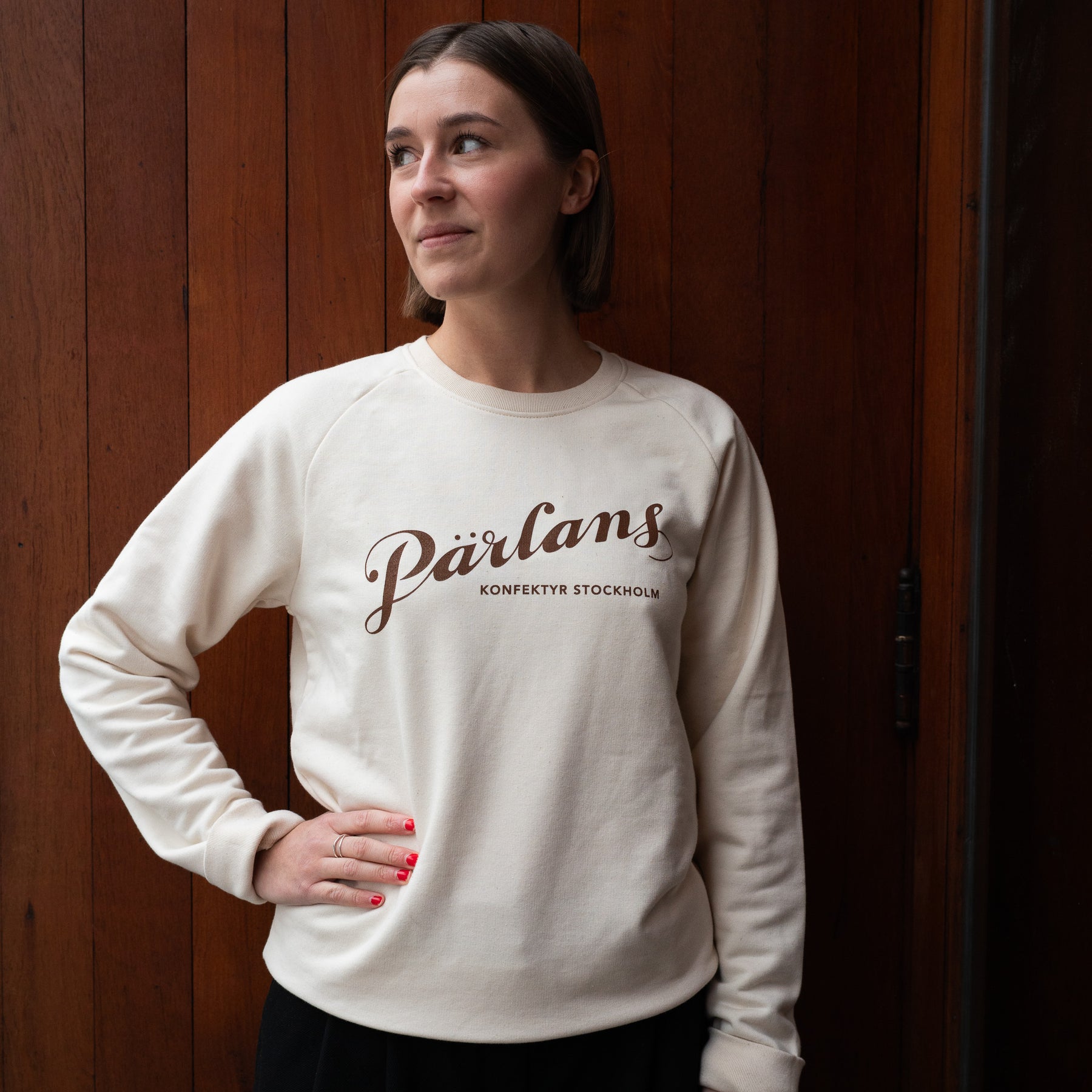 Håll dig varm och go med en klassiskt krämvit sweatshirt med brun Pärlan-logga!
